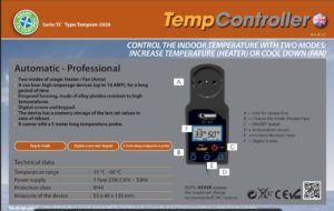Ce contrôleur de température Cli-Mate 16 Amp, permet de gérer la vitesse et la température d’un système de chauffage et de refroidissement. Il dispose d’un capteur de température déporté de 5 mètres.